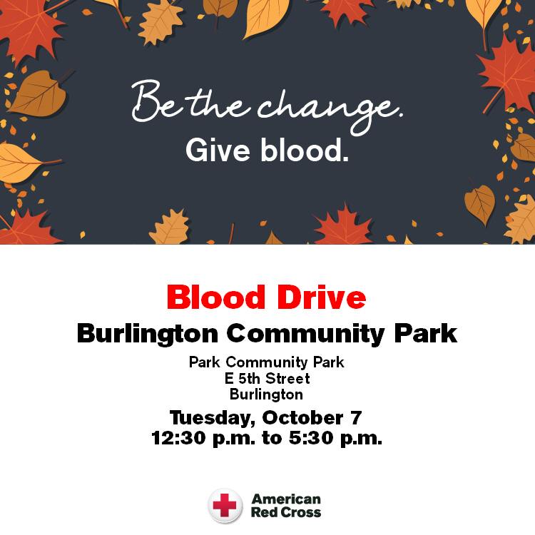 Red Cross Blood drive Tuesday, 10/7, 12:30-5:30pm. Schedule at www.redcrossblood.org