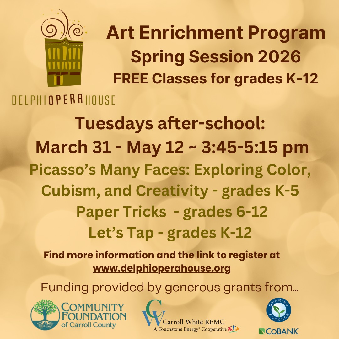 This will be the 4th spring session of the popular after-school art enrichment program at the Delphi Opera House. There are classes for students in grades K-12, and they are entirely FREE thanks to generous grants from the Community Foundation of Carroll County, Carroll White REMC, and CoBank. Find details about the 3 classes at the bottom of the Delphi Opera House website homepage. Registration will open at 8 am on March 4th. Classes fill quickly, so put the date on your calendar.