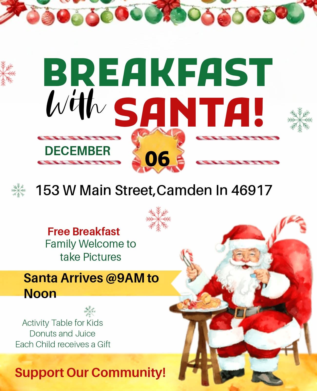 Free breakfast – family welcome to take pictures. Santa arrives at 9 a.m. to noon. Activity table for kids. Donuts and juice. Each child receives a gift.