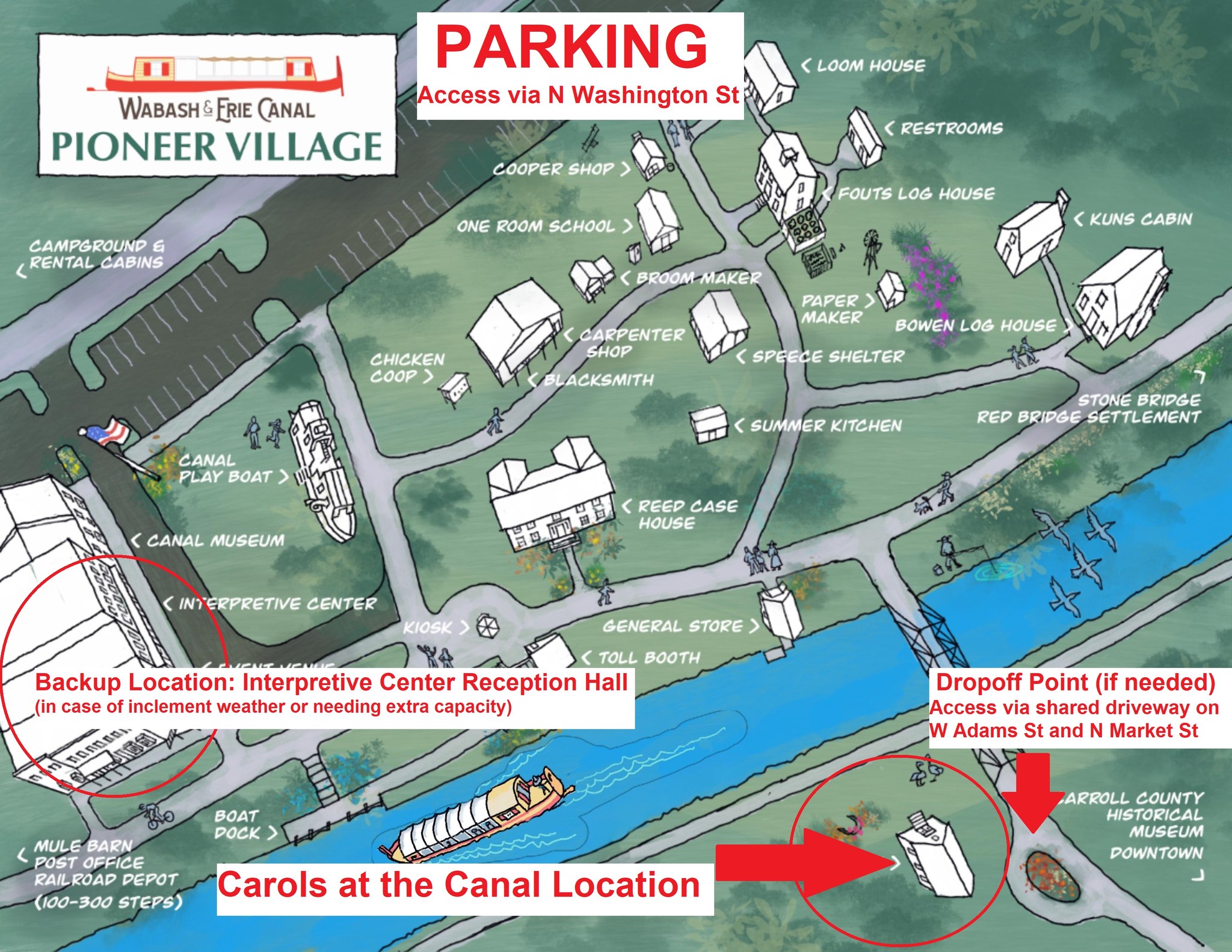 Parking will be in the main lot of Wabash & Erie Canal Park, and it’s a short stroll across the canal to the White Chapel. There is a drop-off point at the chapel for those with limited mobility, accessible via the shared driveway on W Adams St and N Market St.