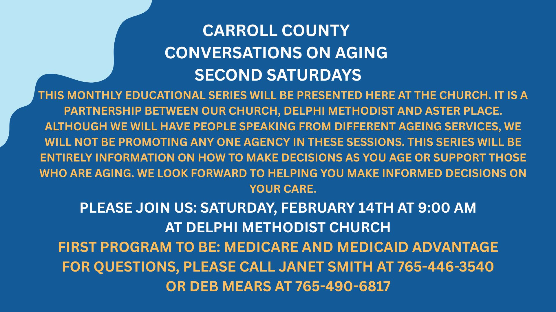 The launch of Carroll County Conversations on Aging, a new monthly educational series presented by Aster Place in partnership with Delphi Methodist Church.