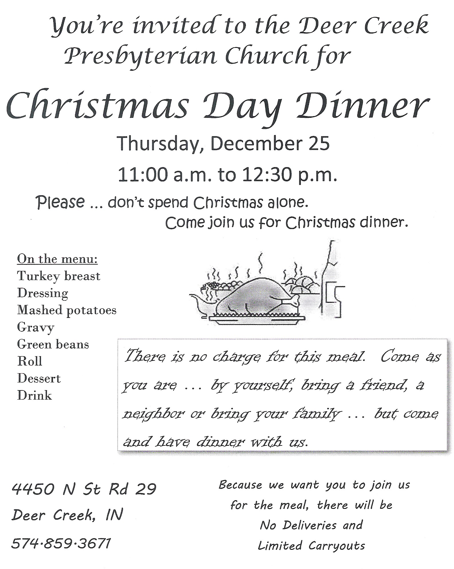 There will not be any deliveries and carry-outs will be limited because we want you to come and join us for the meal and be in the company of others, not alone.