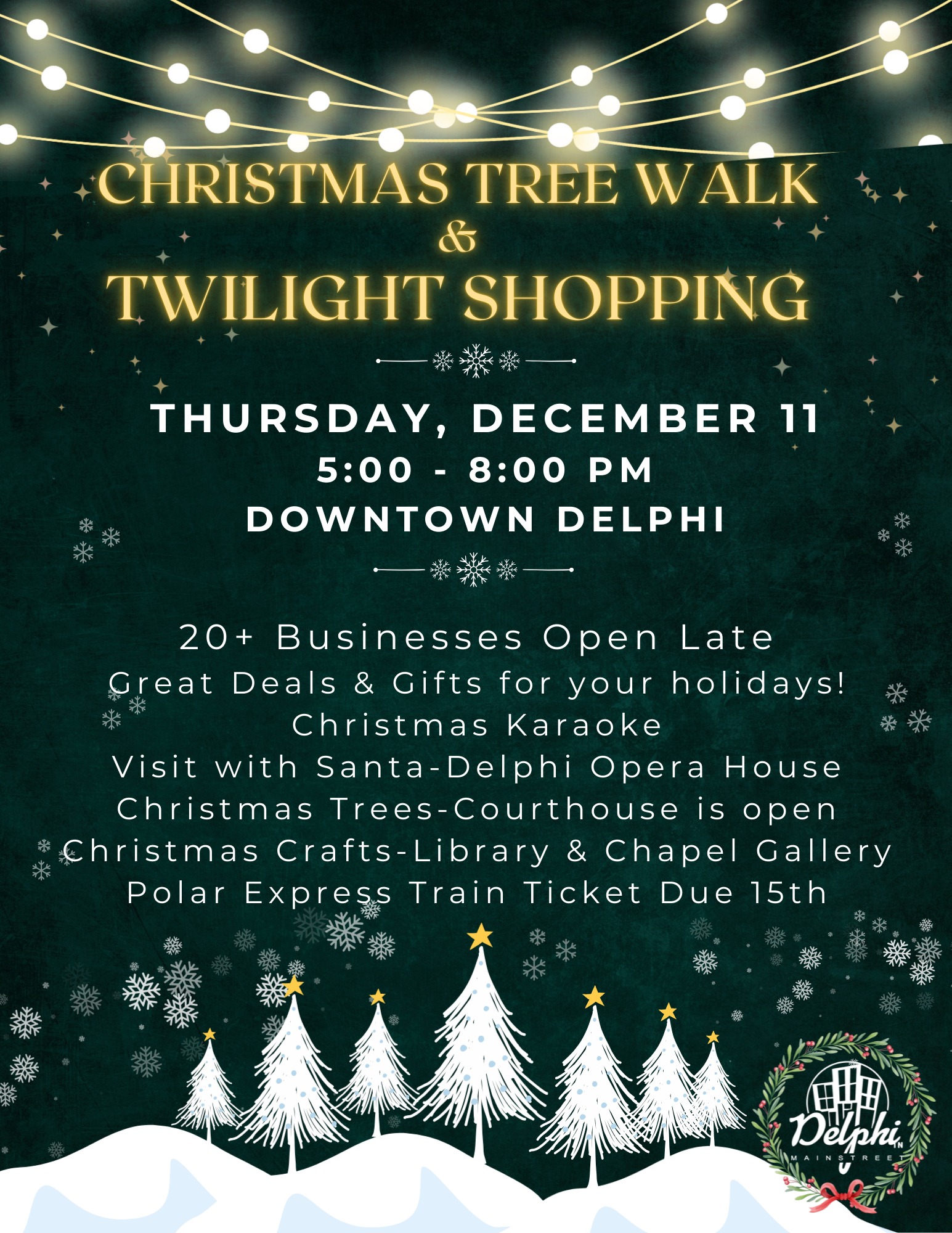 Join us in historic downtown Delphi for our final Christmas Tree Walk & Twilight Shopping Event on Thursday, December 11 from 5-8pm. You won’t want to miss all of the amazing activities, fabulous gifts, and last minute shopping deals for everyone on your holiday list.ย More info