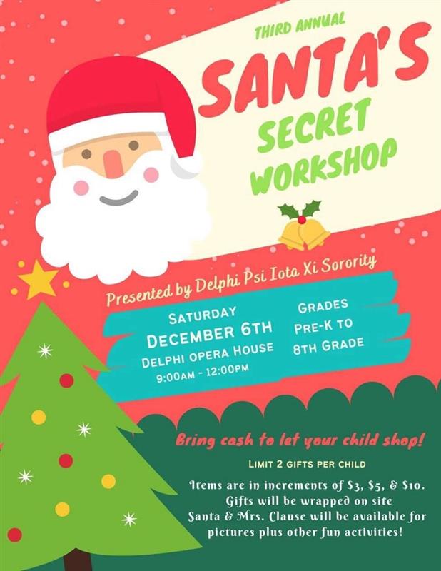Let your little elves (pre-K through 8th grade) do their own Christmas shopping! Gifts are just $3, $5, or $10, with a limit of 2 per child, and each gift will be wrapped for free. Fun, festive, and kid-friendly—presented by Psi Iota Xi Sorority!